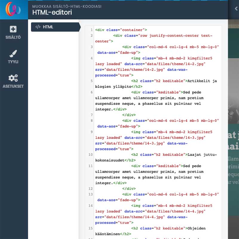Jokainen sisältöalue on muokattavissa myös HTML-tilan kautta
